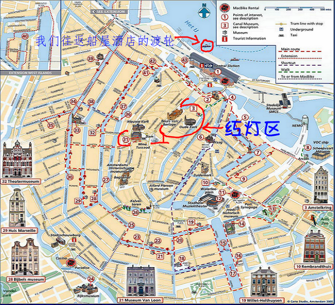 | 每个大城市都有自己的个性,或曰“名片”,荷兰首都阿姆斯特丹,其开放和宽容举世闻名,其中尤以木鞋、奶酪和性,被八方游客称之为“荷兰三宝”,随处可见的3个X(xxx)就是阿姆斯特丹的标志(见图1-2)。 阿姆斯特丹几百年来共发展出了三个红灯区(RED LIGHT ),分别是de Wallen、Singelgebied和de Pijp,而位于旧城中心运河边的德瓦伦(de Wallen)最为有名,蜘蛛网般密集逼仄的细巷中挤满了娼寮、性商店和大麻馆,娱乐和危险指数一直高居世界大都会之首,是把玩玩到玩命的游客必去的主要旅游点。 1,荷兰旅游局印制的阿姆斯特丹市中心地图,①是中央火车站,31是水坝广场: 阿姆斯特丹市徽: 2,我们沿着丹拉克大街走向老城中心的水坝广场,它是阿姆斯特丹老城的标志性景区。几张沿路街景: -真的假的? 雕像也有累的时候,坐这儿卷根烟抽: "我和你吻别 在无人的街... ",俺的经验,这时候他俩是感觉不到周围的喧嚣滴... 3,荷兰3宝中的奶酪和木鞋非常吸引眼球: 4,到了建于12世纪的水坝广场(Dam)。俺在前面第22集说过,荷兰有1/3以上国土是靠水坝围出来的,广场中间那根图腾柱是国家纪念碑(National Monument),为纪念二战中丧生的荷兰人民而立。后边是著名的克拉斯那不勒斯基大饭店 (Hotel Krasnapolsky): 5,荷兰皇宫: